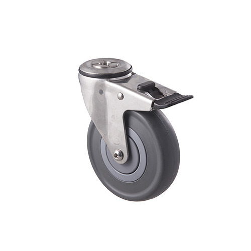 This castor is fitted with a Grey Rubber wheel. Grey Rubber Wheels are shock absorbing and minimise vibration thus prolonging equipment life and protecting the load. They can roll over small objects and roll easily on rough floors. As they are non-marking Grey Rubber Wheels help protect costly floor surfaces.