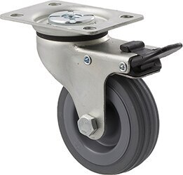 This castor is fitted with a Grey Rubber wheel. Grey Rubber Wheels are shock absorbing and minimise vibration thus prolonging equipment life and protecting the load. They can roll over small objects and roll easily on rough floors. As they are non-marking Grey Rubber Wheels help protect costly floor surfaces.